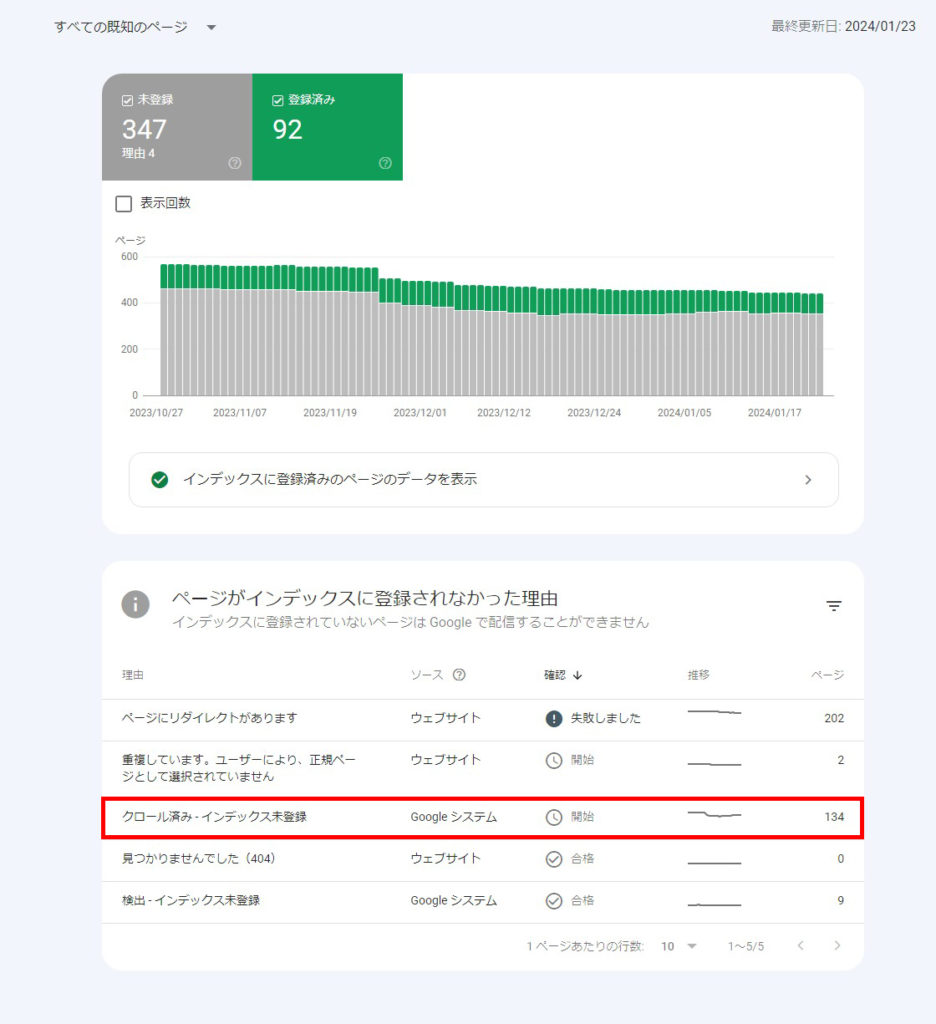 『クロール済み – インデックス未登録』の134ページは、インデックスする価値がないと判断されてしまったページらしい。